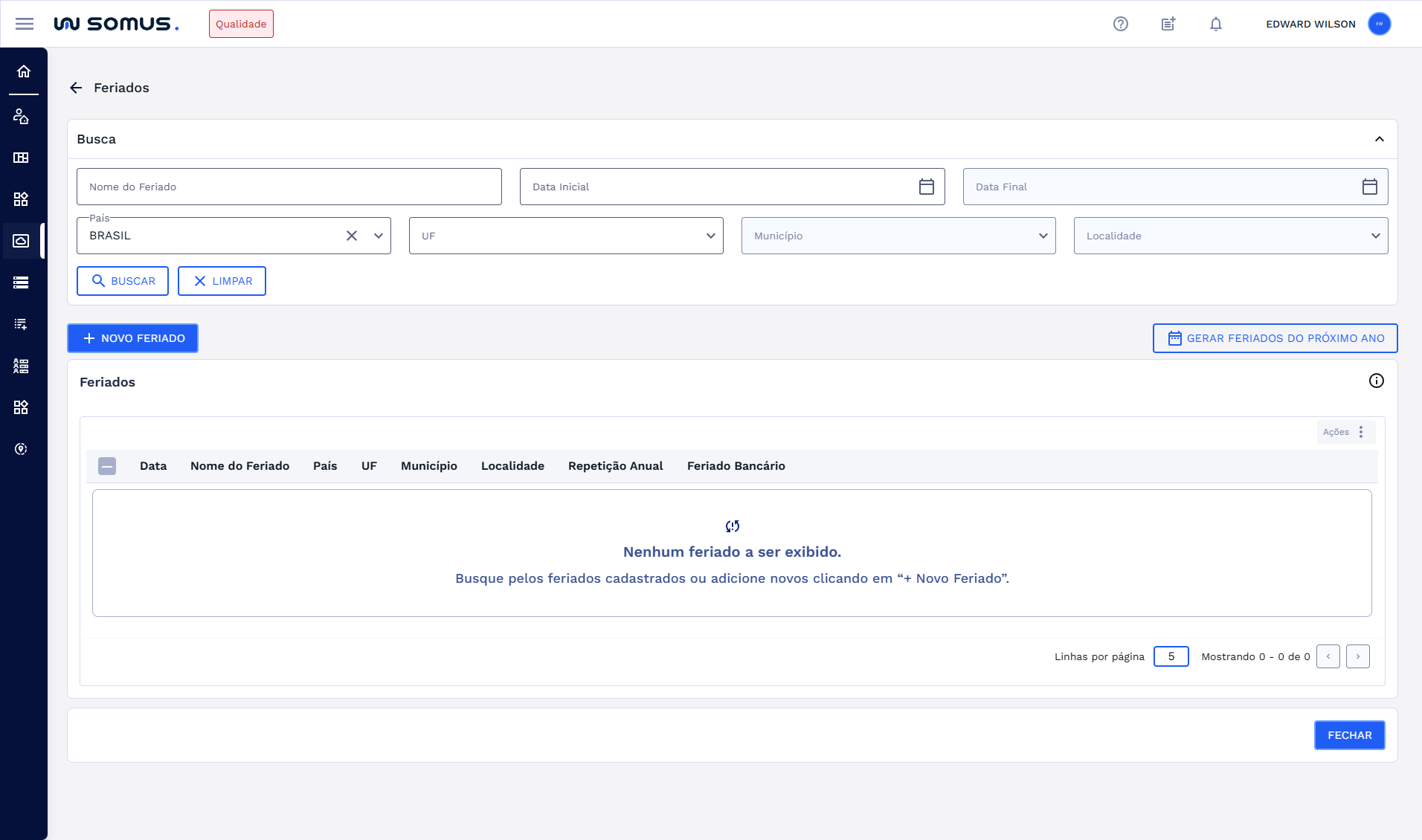 Para cadastrar feriados, clique em + NOVO FERIADO.