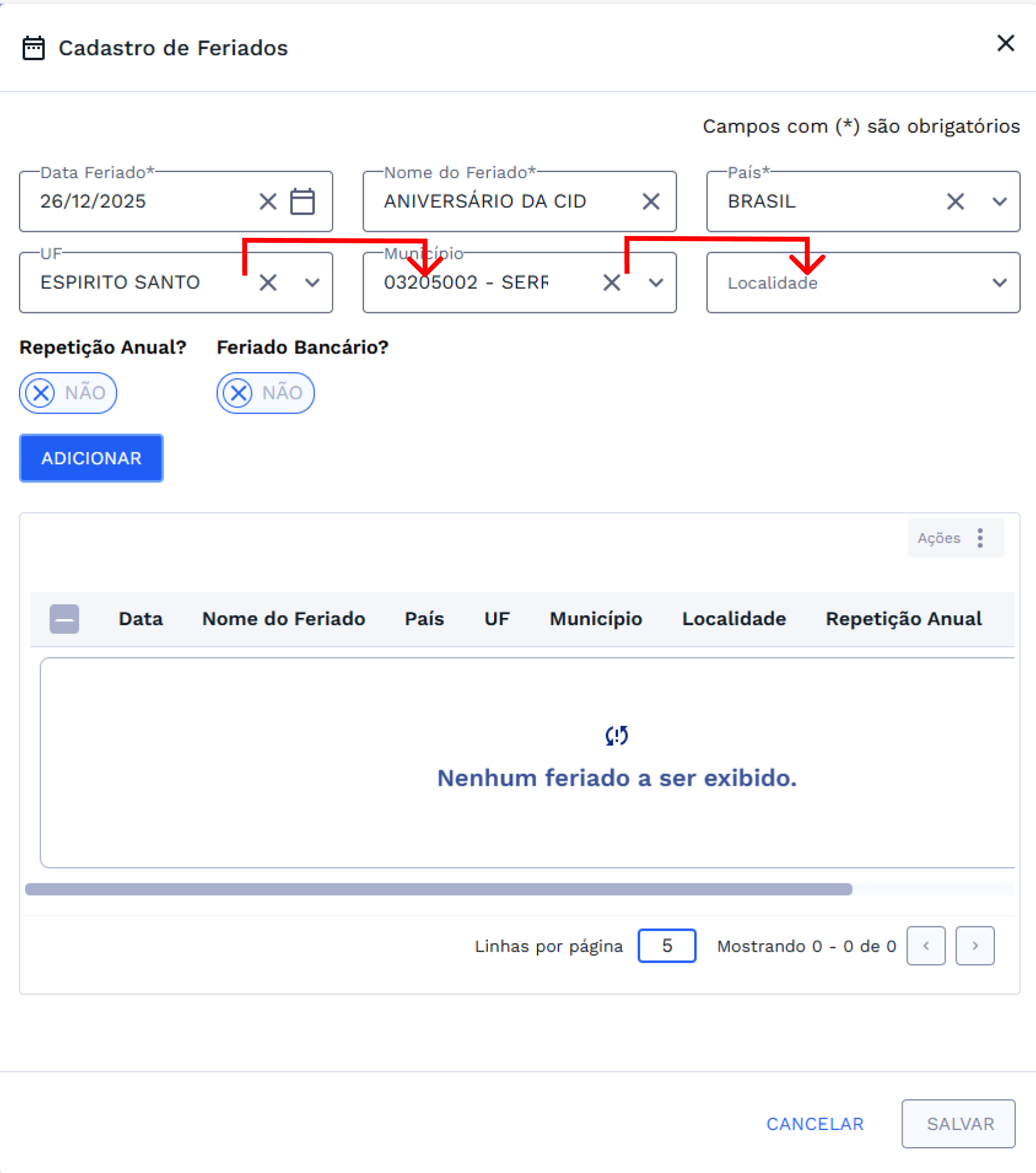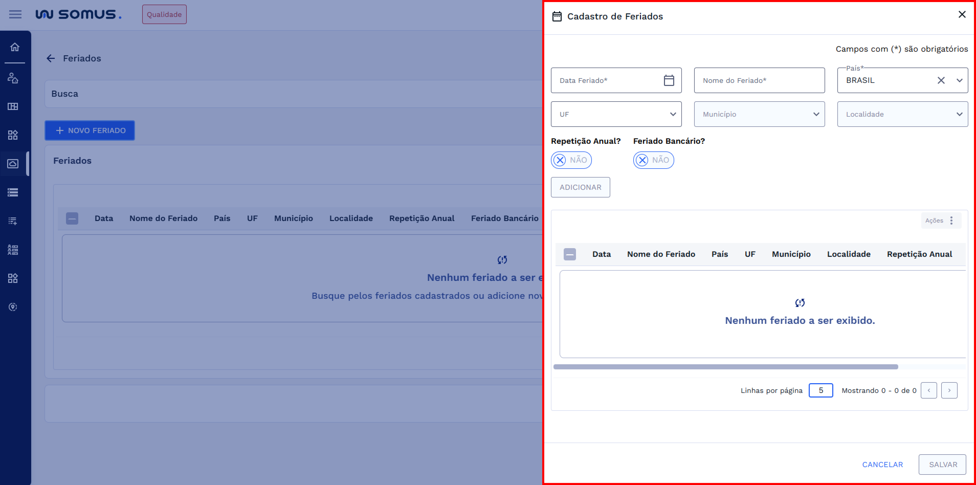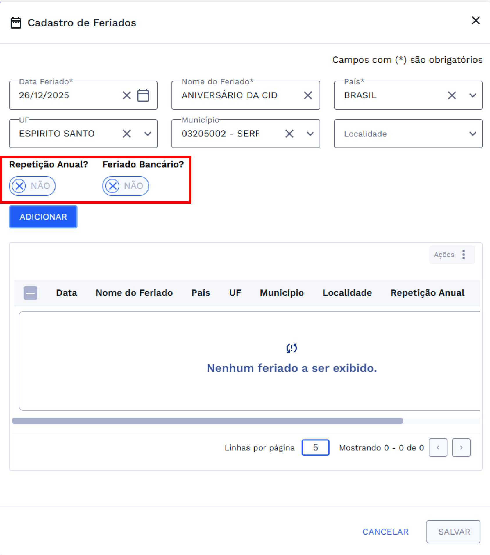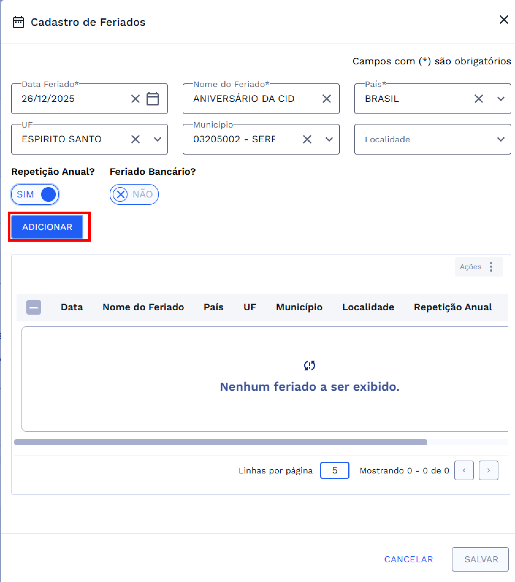 Ao clicar, será aberto um formulário para o cadastro de feriados.