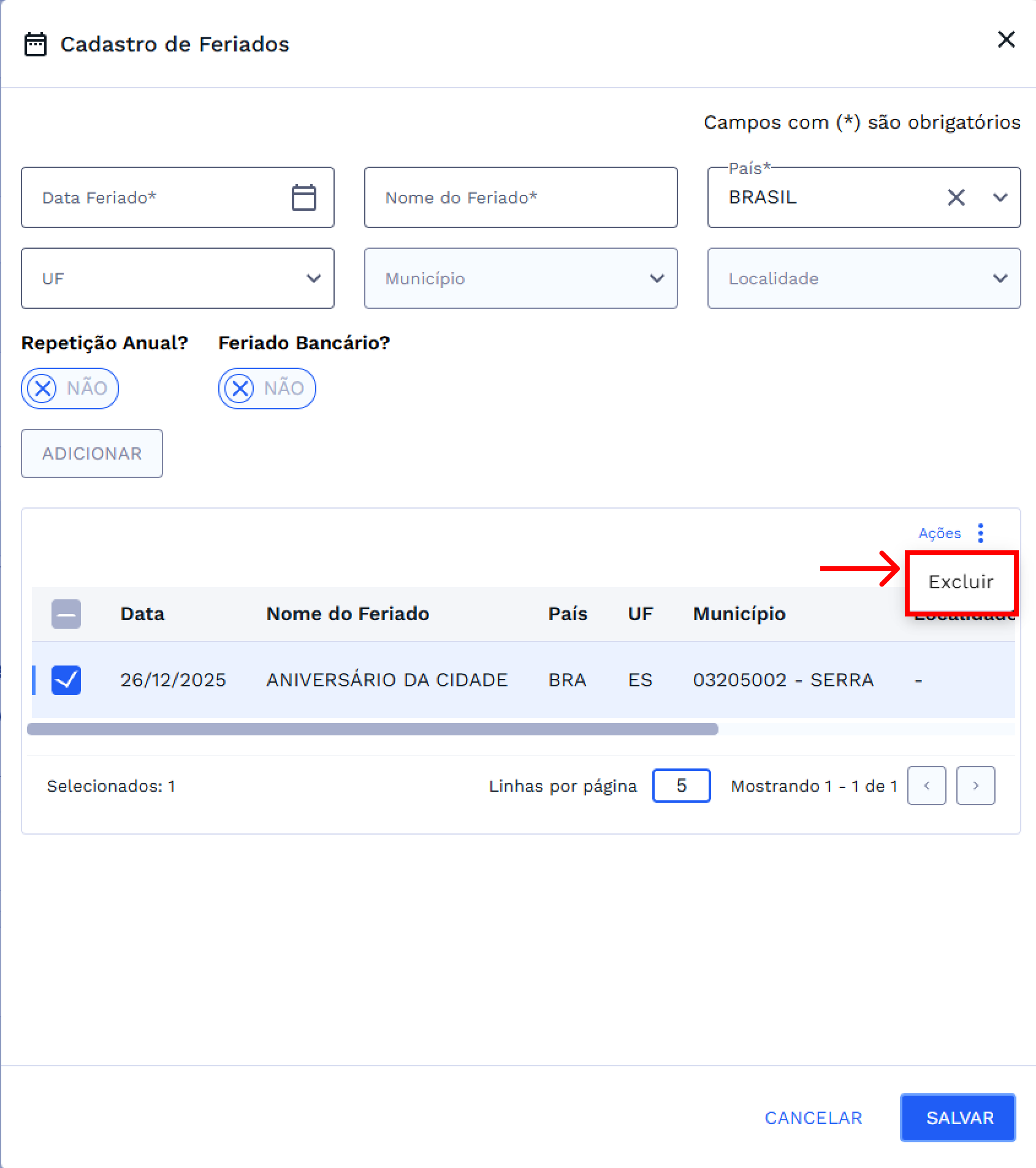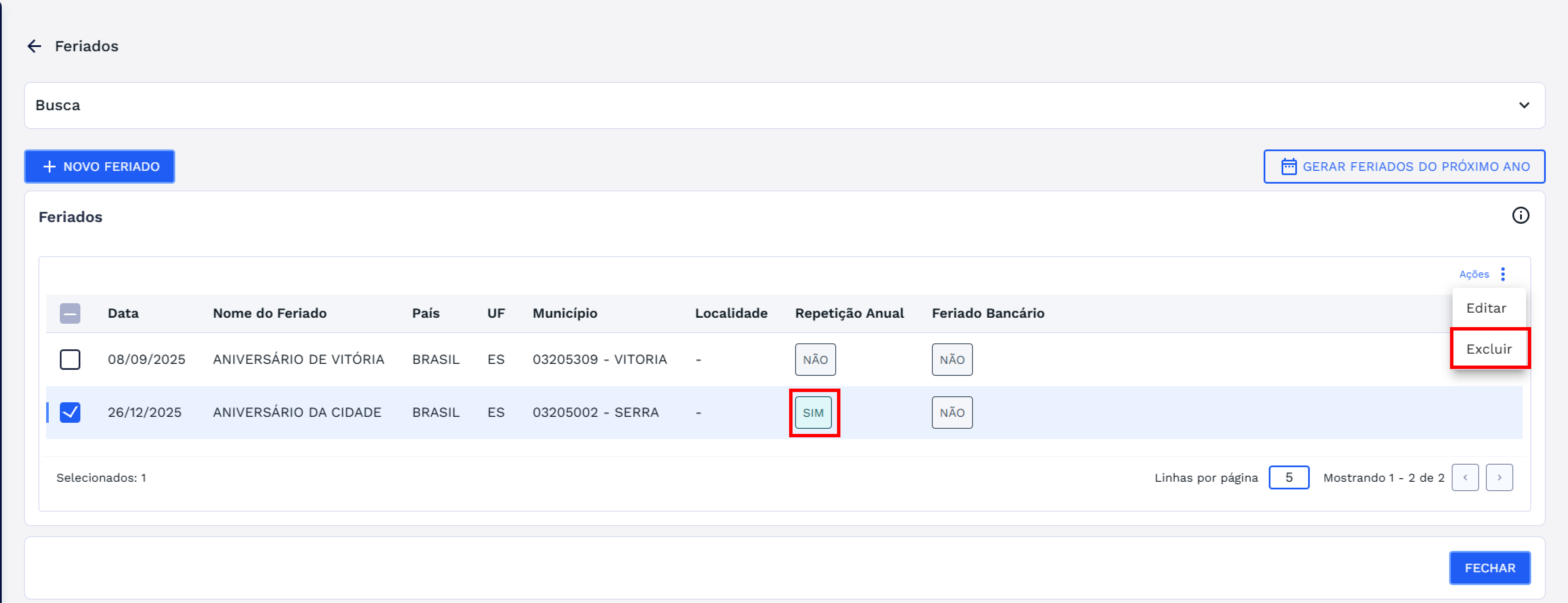 Um feriado só poderá ser excluído se tiver sido cadastrado para repetir anualmente. Para excluir um feriado, basta selecioná-lo na tabela, clicar em AÇÕES e, em seguida, em EXCLUIR.
