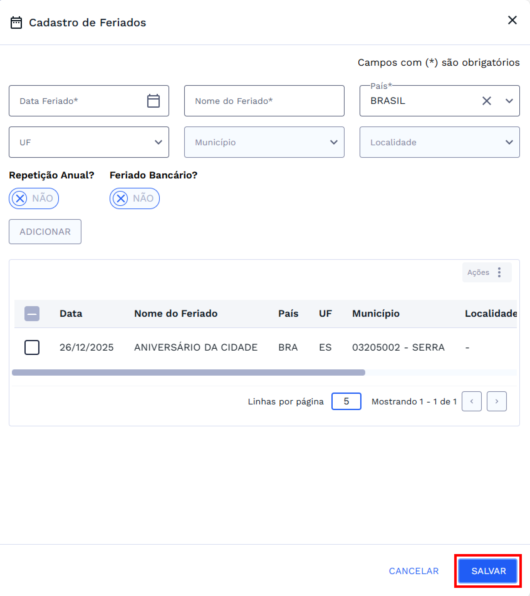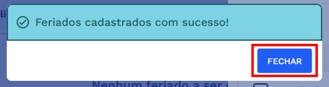 Com os feriados registrados na tabela, clique no botão SALVAR para finalizar o cadastro.