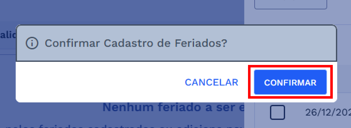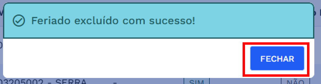 Após sua escolha, o sistema excluirá o feriado permanentemente, e os dados não poderão ser recuperados.