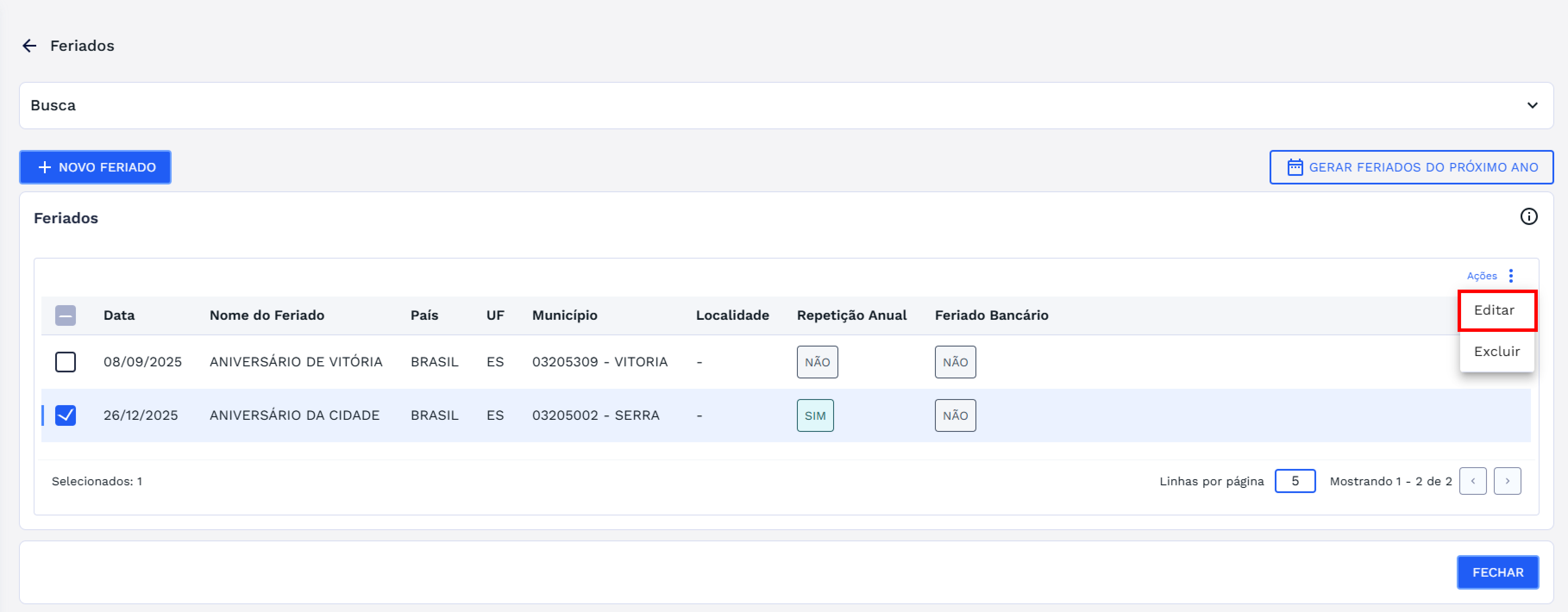 Para editar um feriado, selecione o feriado desejado na tabela, clique em AÇÕES e, em seguida, clique em EDITAR no lado direito da tela.