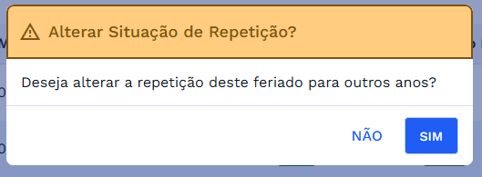 IMPORTANTE: Caso você altere o status de repetição do feriado, ao SALVAR, após a caixa de diálogo de confirmação, você verá uma segunda confirmação na tela. Nessa etapa, poderá escolher se as alterações serão aplicadas apenas ao feriado vigente ou a esse feriado em outros anos.