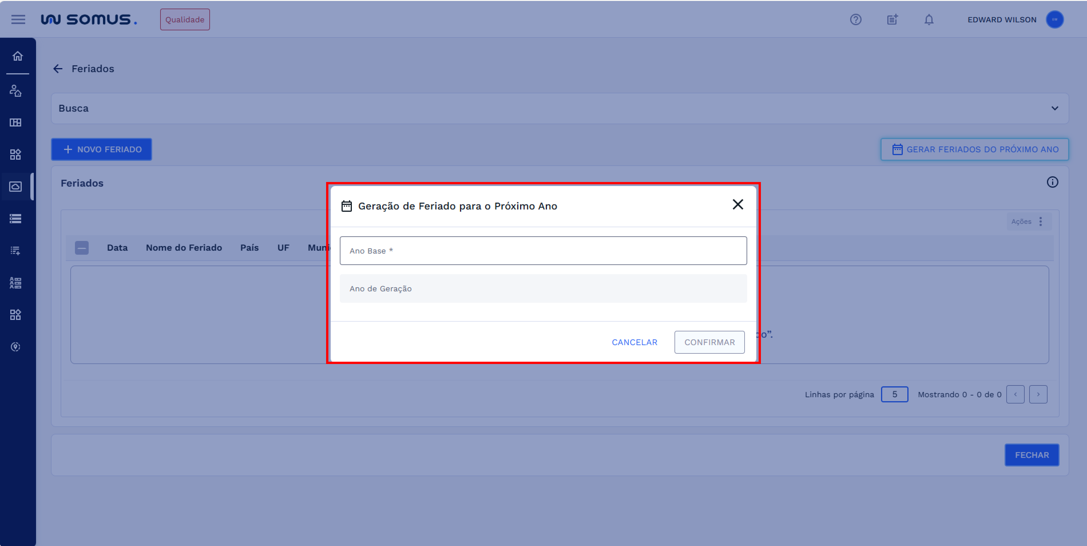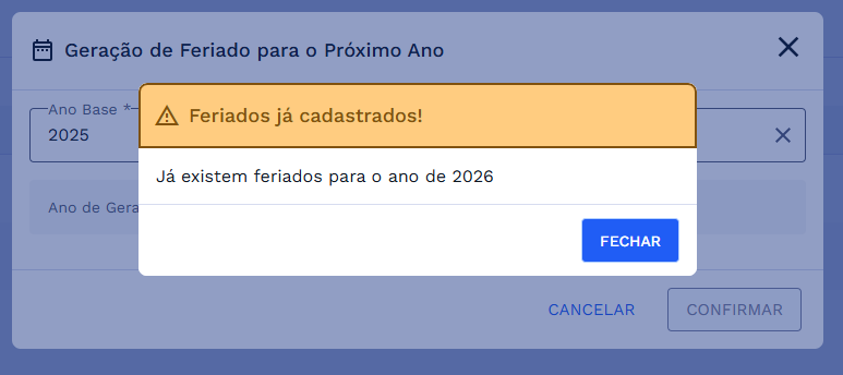 O processo de geração de feriados do próximo ano inclui duas validações após o preenchimento do campo Ano Base, que podem impedir a geração dos feriados.