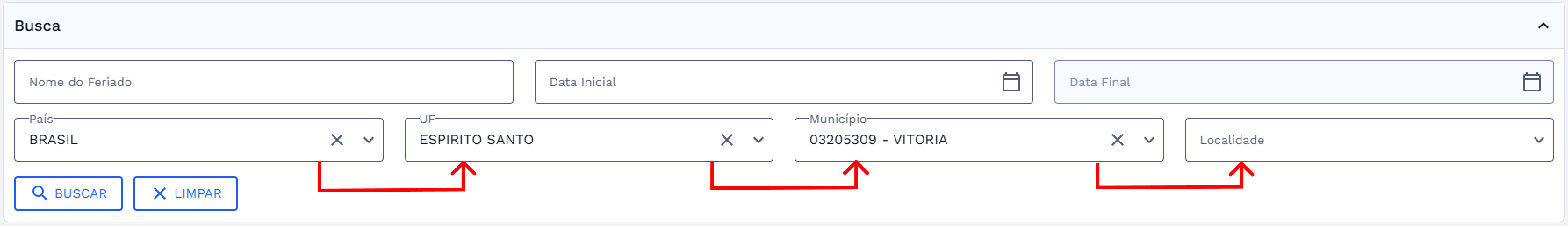 - Filtro por período Ao filtrar os feriados por período, é necessário utilizar os campos Data Inicial e Data Final. O campo Data Final só será habilitado para preenchimento após a Data Inicial ser informada.
