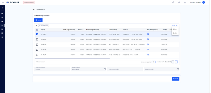 Botão Ações: Botão de ação que permite a edição e exclusão do logradouro selecionado.